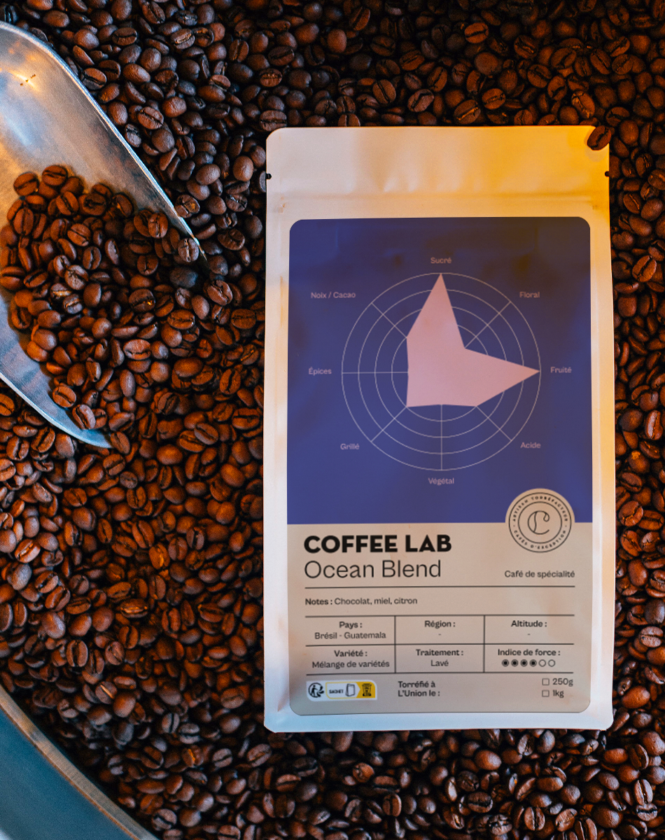 « L’Ocean Blend, c’est le café qu’on a mis le plus de temps à finaliser, parce que trouver un équilibre entre trois origines qui s’harmonisent vraiment, c’est plus complexe qu’il n’y paraît. Le 60/20/20 Brésil-Colombie-Guatemala est le résultat de nombreux essais. Ce qu’on cherchait : un café qui n’a pas d’ennemi, ni trop acide pour les uns, ni trop amer pour les autres, ni trop neutre pour tout le monde. Le chocolat au lait du Brésil, la noisette du Cauca, le caramel de Huehuetenango, trois origines qui se connaissent, qu’on a choisies parce qu’elles traversent l’Atlantique à la voile. Ce n’est pas anecdotique : un café acheté directement à des producteurs de qualité et transporté proprement, ça change le goût de la chose. »