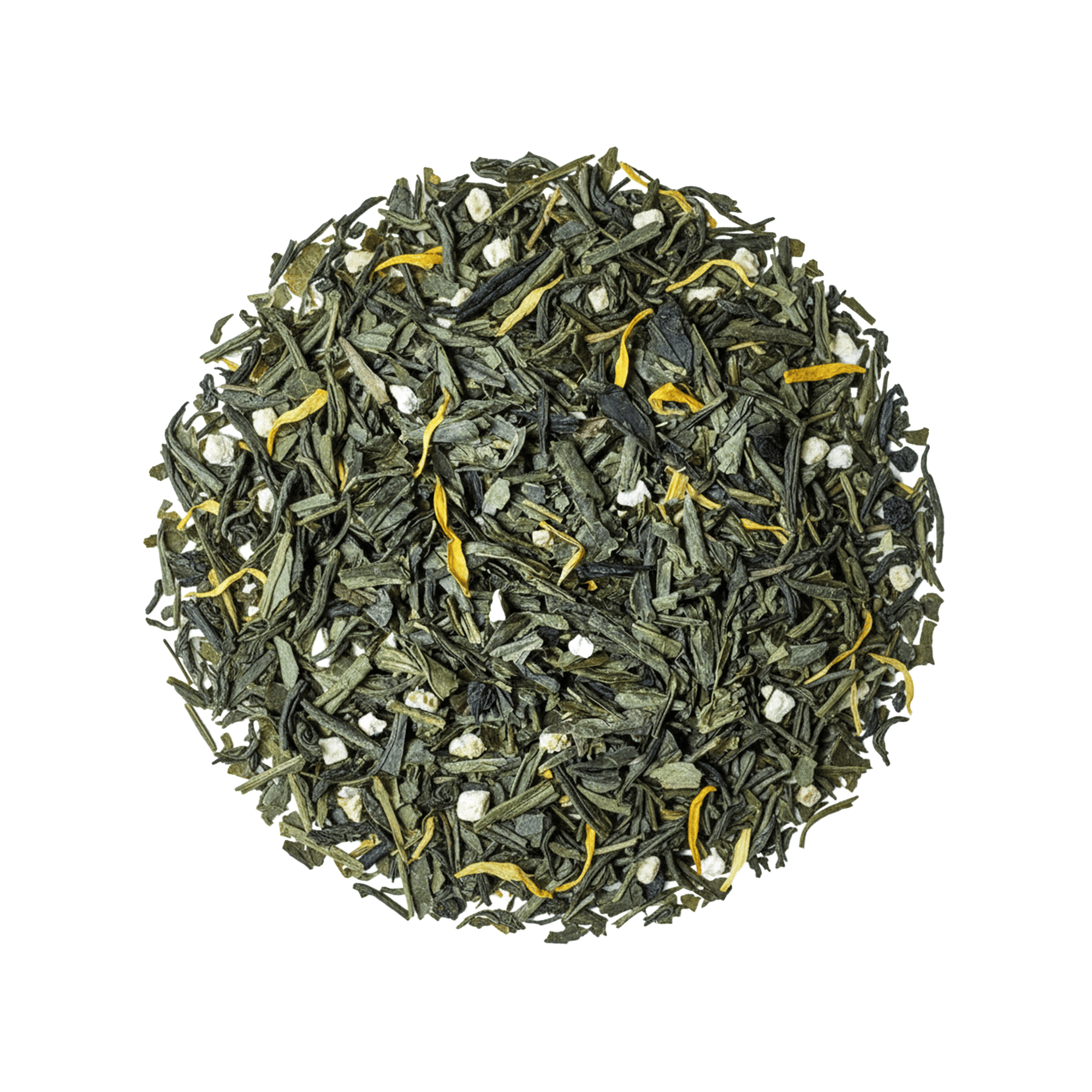 thé vert Sencha Guizhou. L’association d’écorces de citron et d’huile essentielle de citron biologique apporte une fraîcheur vive et naturelle, parfaitement équilibrée par les notes végétales du thé vert.